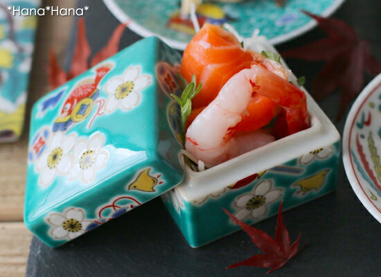 明るく華やかな意匠の角型蓋付き豆鉢です。