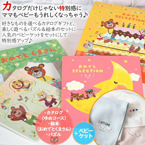 セット内容カタログギフト(おめでとセレクション ゆめコース)絵本・パズル×各1掲載商品数:52ページ、約50点(冊子)、約260点(WEB)ベビーケット×1商品サイズカタログギフト(ギフトボックス入り) ・カタログギフト:約縦18.5×横18.5×厚さ0.4cm ・絵本(おめでとくまさん):約縦18.5×横18.5×厚さ1.2cm ・パズル:約縦15×横15×厚さ0.8cm(持ち手含まず)ベビーケット:約73×120cm箱サイズ約幅28cm×縦28cm×厚さ10cm商品カラー(ベビーケット) アイボリー、ブルー、ピンク素材(ベビーケット) 綿100%(オーガニックコットン50%)生産国(ベビーケット) 日本製納期営業日12時までにいただいたご注文に関しましては当日中に発送いたします。