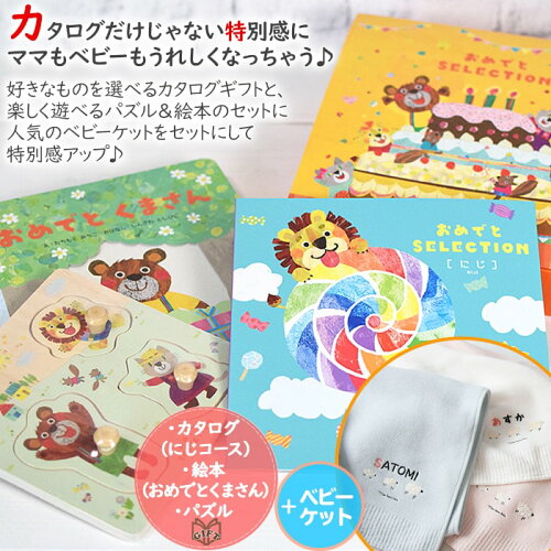 セット内容カタログギフト(おめでとセレクション にじコース)絵本・パズル×各1掲載商品数:52ページ、約50点(冊子)、約260点(WEB)ベビーケット×1商品サイズカタログギフト(ギフトボックス入り) ・カタログギフト:約縦18.5×横18.5×厚さ0.4cm ・絵本(おめでとくまさん):約縦18.5×横18.5×厚さ1.2cm ・パズル:約縦15×横15×厚さ0.8cm(持ち手含まず)ベビーケット:約73×120cm箱サイズ約幅28cm×縦28cm×厚さ10cm商品カラー(ベビーケット) アイボリー、ブルー、ピンク素材(ベビーケット) 綿100%(オーガニックコットン50%)生産国(ベビーケット) 日本製納期営業日12時までにいただいたご注文に関しましては当日中に発送いたします。