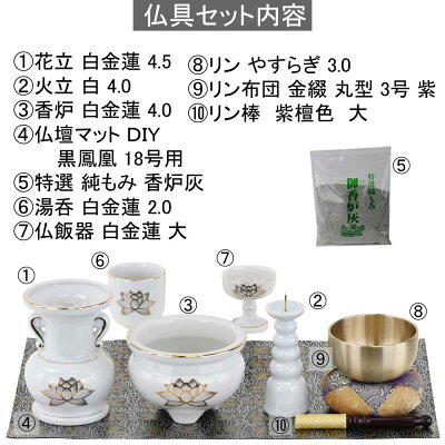 仏具セット内容 1.花立 白金蓮4.5(高さ13.5×直径9cm) 2.火立 白4.0(高さ13×直径4.7cm) 3.香炉 白金蓮4.0 (高さ8.1×直径12.6cm) 4.仏壇マット DIY 黒鳳凰 18号用(縦28×横43.2cm) 5.特選 純もみ 香炉灰 (3の香炉の中に入れて使用します) 6.湯呑 白金蓮2.0(高さ6.4×直径6.2cm) 7.仏飯器 白金蓮 大 (高さ6.3×直径5.8cm) 8.リン やすらぎ 3.0(高さ4×直径7.5cm) 9.リン布団 金綴 丸型 3号 紫(高さ3.5×直径8cm) 10.リン棒 紫檀色 大(長さ13.8cm) >>『仏具セットのカテゴリー(仏具セットの全種類を見る)』はこちら
