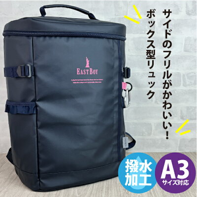 商品情報 女子に大人気のEAST BOYのボックス型リュック 丈夫な撥水加工が施された素材に流行のフリルを取り入れたガーリ—なデザイン ロゴ入りのハート型のカラビナ付き 部活動やレジャーにもおすすめです。