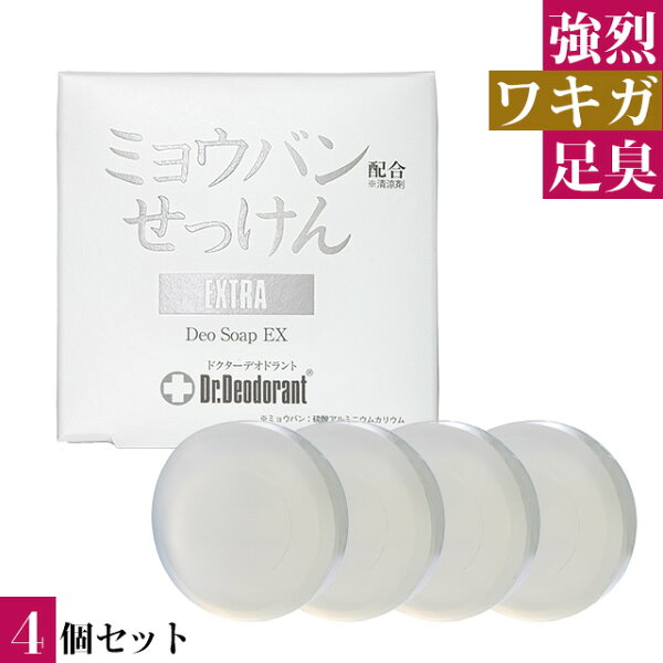 ミョウバンせっけんEX お得4個セットメーカー希望小売価格はメーカーサイトに基づいて掲載しています 商品名【わきが 足のにおい 体臭 加齢臭 デリケートゾーンのにおい対策】ドクターデオドラント ミョウバンせっけん エクストラ(薬用デオソープ-EX)全成分 【有効成分】イソプロピルメチルフェノール【その他成分】カリウム含有石けん用素地、精製水、グリセリン、ソルビット液(70%)、パーム核油脂肪酸、塩化ナトリウム、ヒドロキシエタンジホスホン酸四ナトリウム液(60%)、エデト酸四ナトリウム四水塩、ダイズエキス、1,3-ブチレングリコール、硫酸アルミニウムカリウム、ハッカ油 効果・効能 ●皮膚の洗浄。
